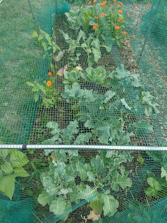 At the plot, I erected the veg cages over Beds 1 and 2. Just in time as the Kalettes and one of the Calabrese plants were started to stoop over.